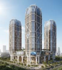 The exterior design of the Eight Storeys building showcases a harmonious blend of contemporary aesthetics and symbolism.